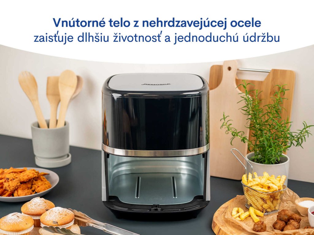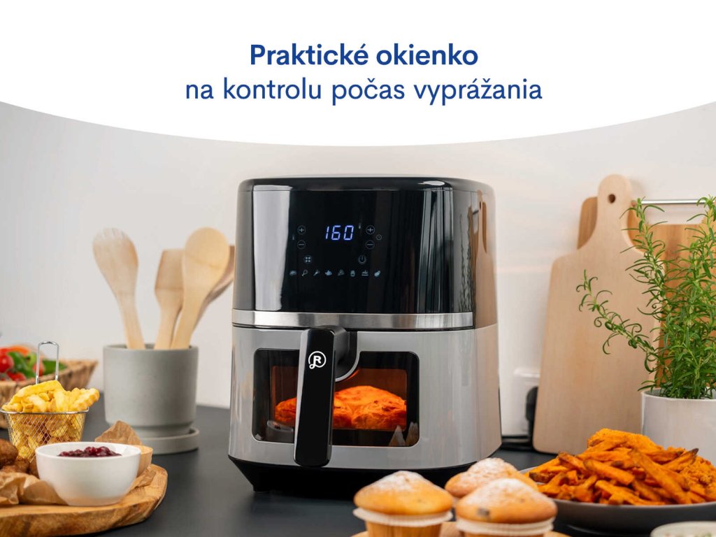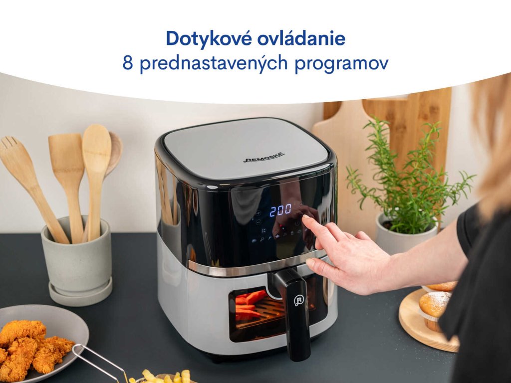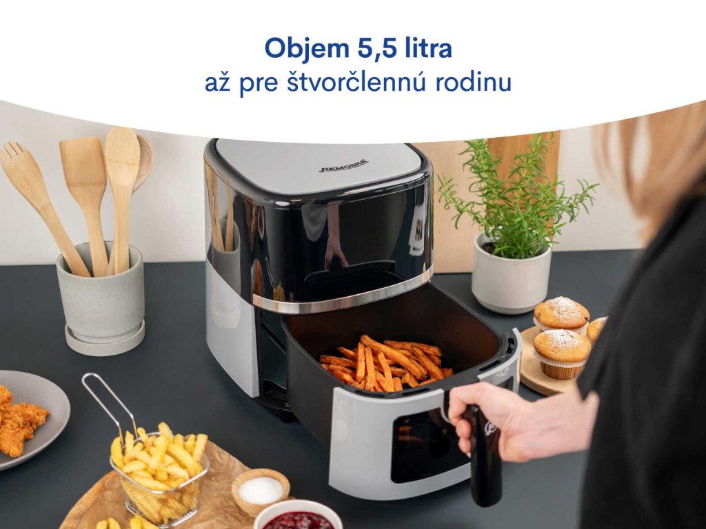 S teplovzdušnou fritézou Remoska® Vento R301001 s objemom 5,5 l pripravíte zdravé a chutné jedlá pre celú rodinu. Fritéza je ideálnym pomocníkom pre zdravé vyprážanie s minimálnym množstvom tuku. Navyše vďaka praktickému okienku je možné jedlo počas vyprážania kontrolovať.