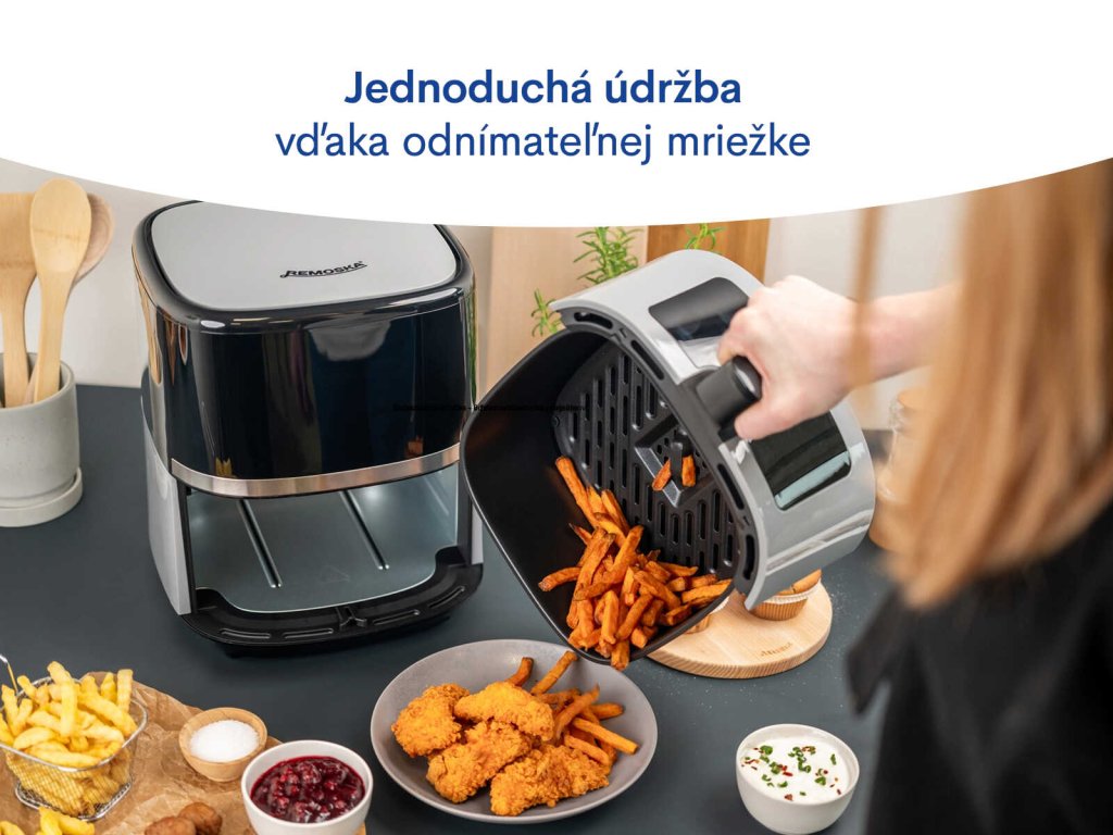 Košík na vyprážanie je vybavený praktickým okienkom, ktoré umožňuje kontrolu jedla počas vyprážania. Nádoba má odnímateľnú mriežku na vyprážanie pre jednoduchšiu údržbu.