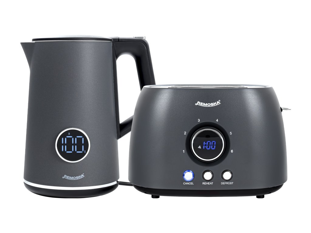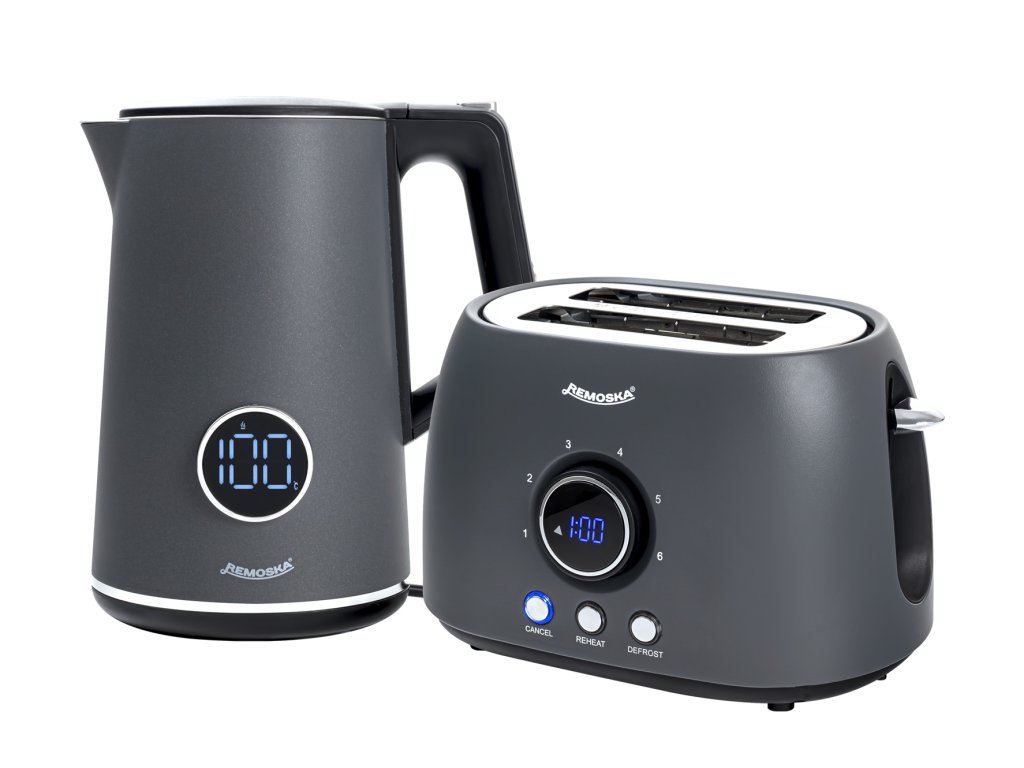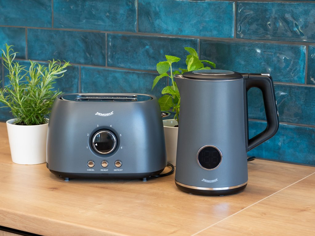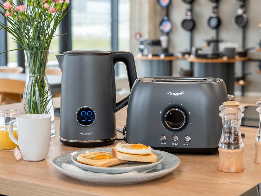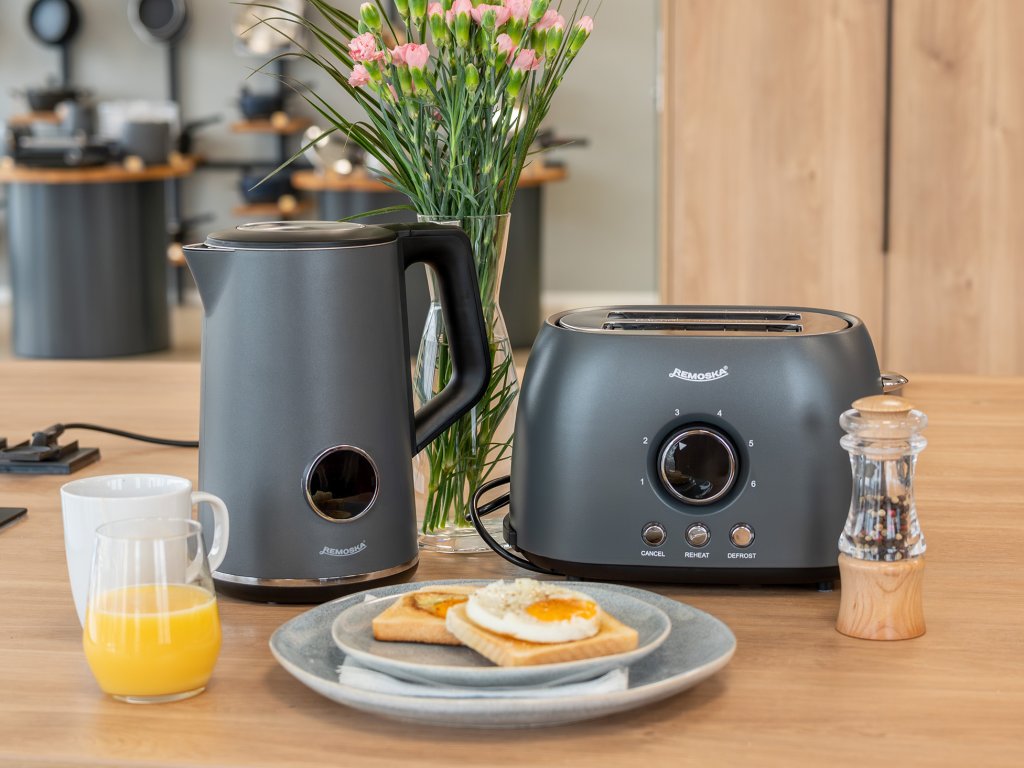 Raňajkový set Remoska® Maria prináša dokonalú kombináciu hriankovača a rýchlovarnej kanvice pre dokonalý štart dňa a každodenné štýlové raňajky. Kombinácia moderného dizajnu a praktických funkcií zabezpečí rýchlu prípravu obľúbených nápojov aj chrumkavého pečiva – ideálna voľba pre pohodové ráno doma aj víkendový brunch.