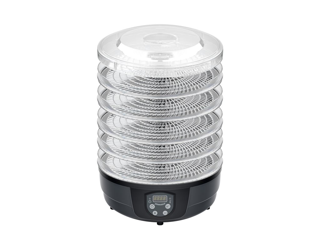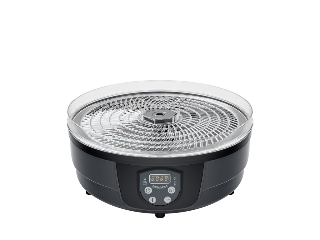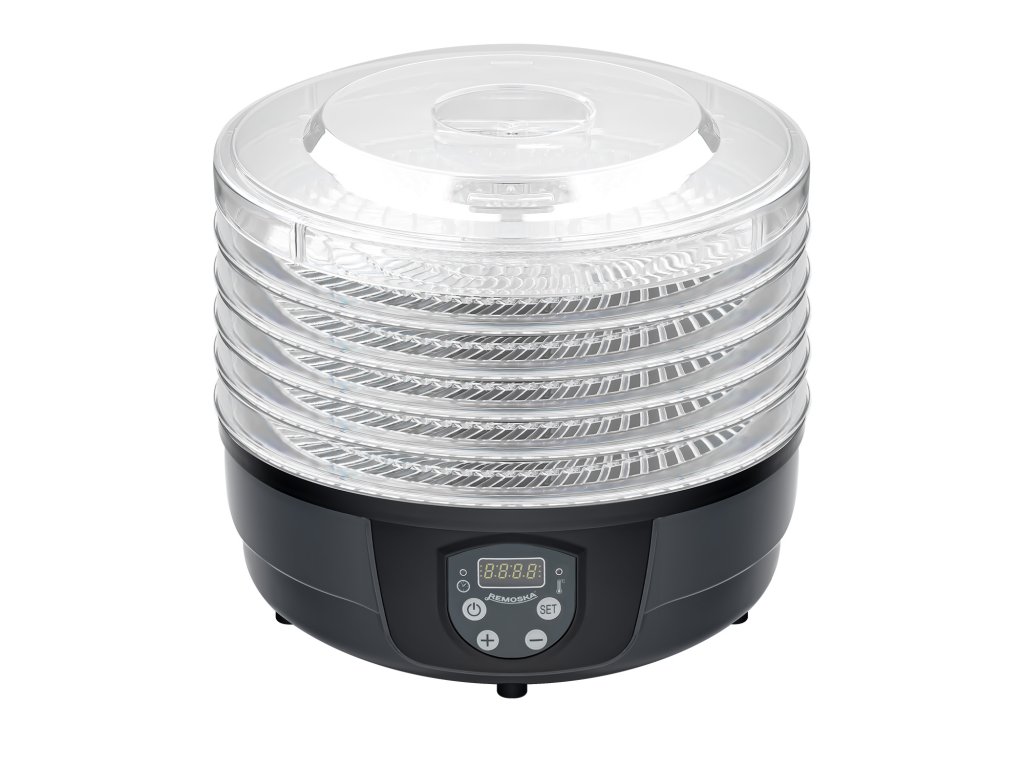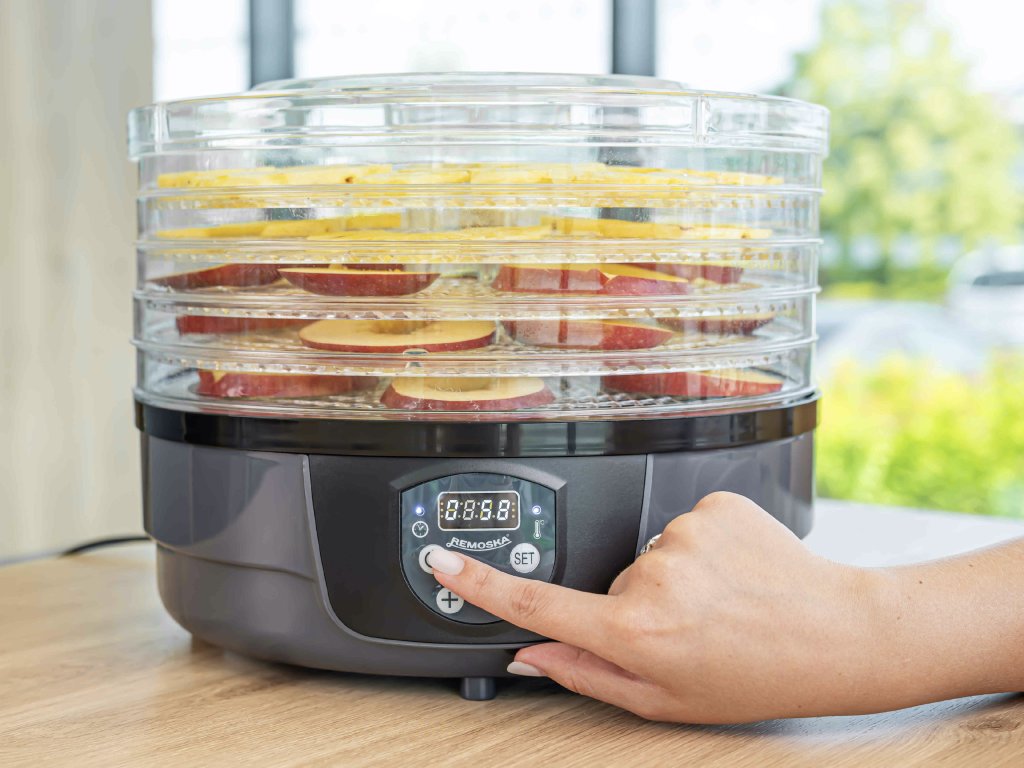 Sušička potravín Remoska® Maria s 5 otočnými plátmi zabezpečuje rovnomerné sušenie ovocia, zeleniny, mäsa aj byliniek bez potreby prekladania plátov.
