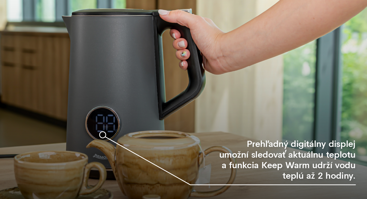 Rýchlovarná kanvica Remoska® Maria spája moderný dizajn a inteligentné funkcie. Vďaka možnosti nastavenia teploty 50, 70, 90 alebo 100 °C si jednoducho pripravíte čaj, kávu alebo iný nápoj presne tak, ako ho máte radi. Prehľadný digitálny displej vám umožní sledovať aktuálnu teplotu a funkcia Keep Warm udrží vodu teplú až 2 hodiny, takže si môžete dopriať ďalší šálok bez potreby znovu variť.