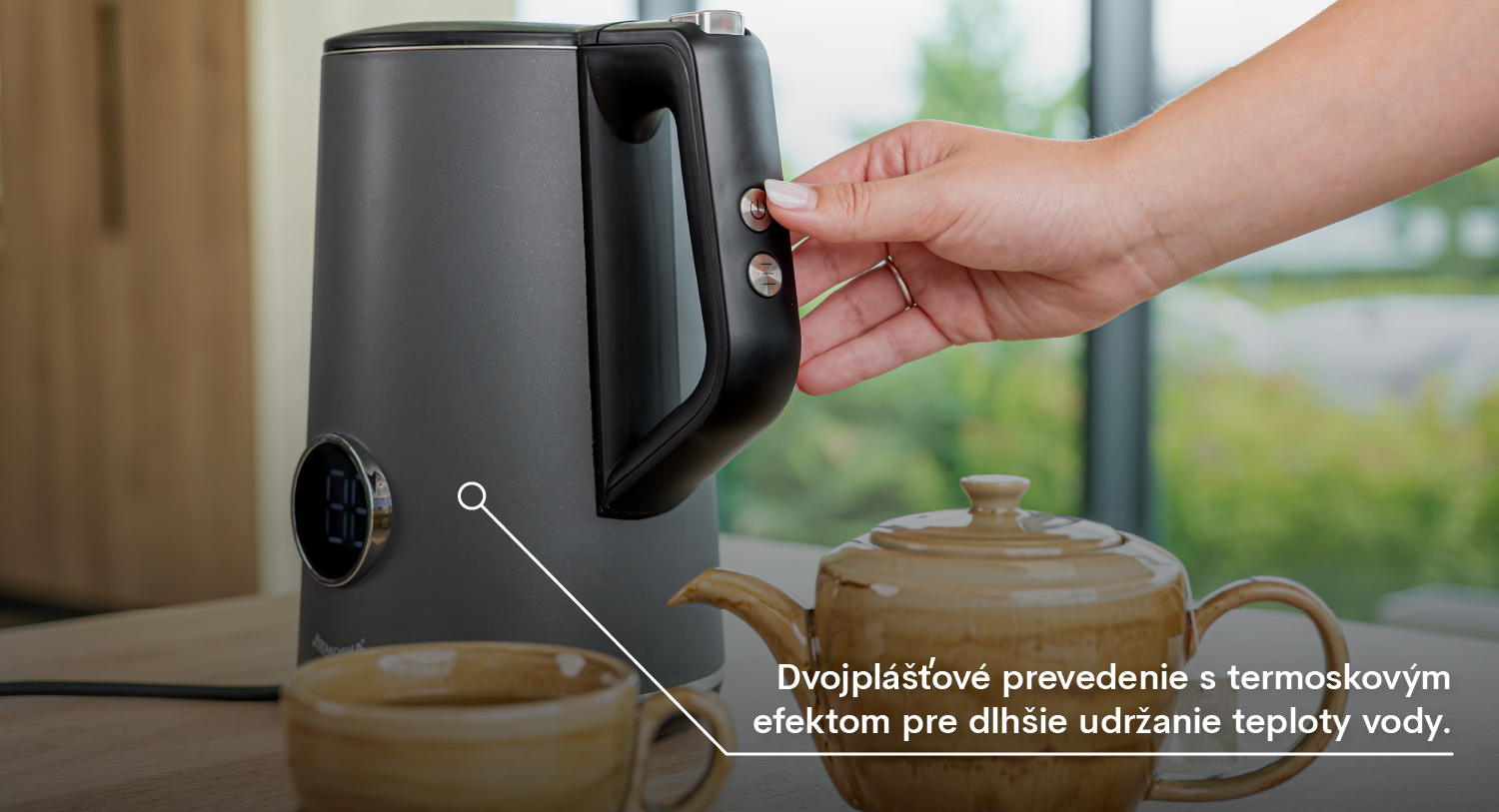 Dvojplášťové prevedenie s funkciou Cool Touch udržiava vonkajšiu časť kanvice chladnú, takže je bezpečná aj pri plnom vare. Nerezové vnútorné telo zabezpečuje rýchly ohrev, odolnosť proti vodnému kameňu a dlhú životnosť. Zároveň vytvára termoskový efekt, vďaka ktorému voda zostane teplá aj po vypnutí kanvice. Protišmykové nožičky pevne držia kanvicu na mieste a automatické vypnutie ju chráni pred prehriatím – pre váš pokoj a bezpečie každý deň.